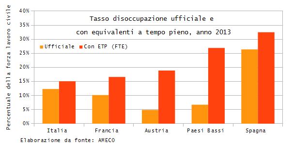 È macroscopico come, in tutti i paesi esaminati, la reale disoccupazione sia ben più alta di quella ufficiale. Clamorosi sono i casi di Francia, Austria e Paesi Bassi, che riportano tutti dati equivalenti peggiori di quello italiano. La Spagna, alla luce di questa analisi, va a sfondare abbondantemente il tetto del 30%.