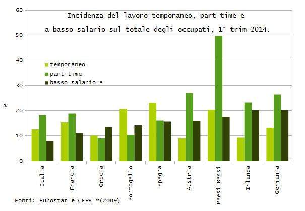 Grafico 5: Incidenza del lavoro temporaneo, part-time e a basso salario, sul totale degli occupati, 1° trim 2014.