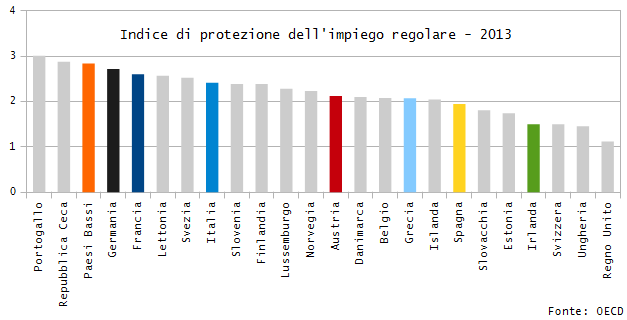 Per fare il punto della situazione, passiamo ad esaminare gli indici di protezione dell’impiego, temporaneo e regolare, elaborati dall’OCSE. [1]
