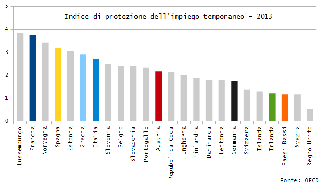 Si vede facilmente come l’Italia va a posizionarsi rispetto a paesi come la Germania, L’Irlanda, i Paesi bassi ed anche l’Austria, in tema di protezione dell’impiego temporaneo, che risulta tra le più alte in Europa, ma fortemente distaccata da paesi come il Lussemburgo, la Francia e la Norvegia.