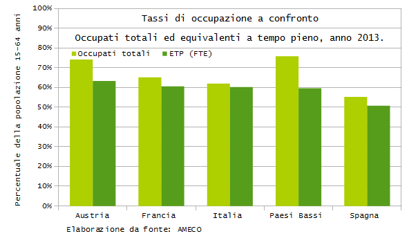 Dove la differenza è più marcata, ovvero Paesi Bassi ed Austria, la qualità dell’impiego è più bassa ovvero c’è una relativamente maggiore fetta di popolazione che non beneficia di un posto di lavoro a tempo pieno.