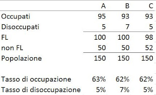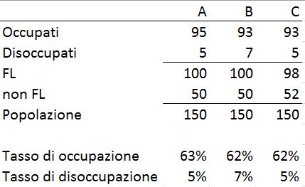 In A gli occupati sono 95, mentre in B e C sono 93. Dato che la popolazione in età attiva è di 150 e tale resta, il tasso di occupazione scende da 63% a 62%. Questo per il tasso di occupazione.