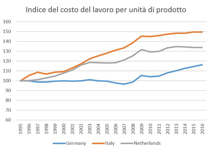 Come è noto, l’Italia ha sperimentato la crescita più elevata del CLUP negli ultimi 20 anni: circa il 42%, rispetto al 17% dei tedeschi. Quello che magari non vi aspettavate è che anche l’Olanda, per quanto virtuosa, ha visto una crescita del CLUP quasi doppia rispetto alla Germania, con dinamiche in certi periodi non dissimili dalle nostre. Lo vediamo plasticamente se rappresentiamo sotto forma di indice le grandezze riportate nella tabella: