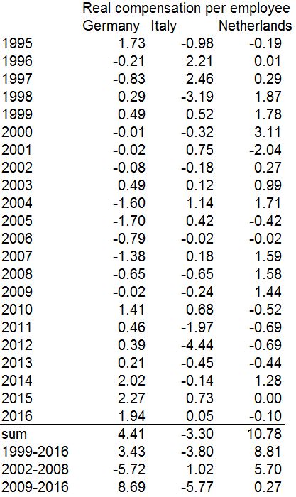 Tuttavia, va notato che in tutti e tre i casi la crescita del salario reale è inferiore a quella della produttività del lavoro. Questo significa che ovunque, anche in Olanda, è diminuita la quota salari (ci torno dopo). Inoltre, osservate come sono andate lo cose nel tempo. Prima della crisi, fra l’adozione delle riforme Hartz nel 2002 e la crisi Lehman nel 2008, i salari reali sono diminuiti del 6% in Germania (-5.72%) e aumentati del 6% in Olanda (5.7%). Una situazione del tutto speculare, con l’Italia in mezzo (crescita di appena l’1% – in sette anni!). La situazione cambia con la crisi: i salari reali in Germania aumentano di quasi il 9%, diminuiscono da noi di quanto erano diminuiti in Germania (del 6%, cioè del 5.77% per i feticisti) e rimangono stagnanti in Olanda.