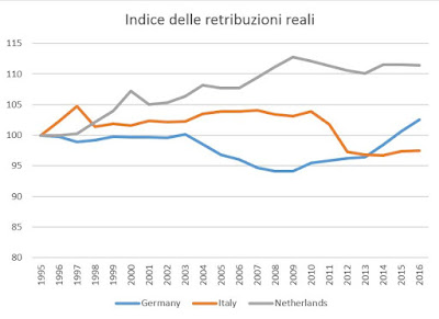 Detto in altri termini: l’Olanda, dalla crisi in poi, ha sperimentato un rallentamento della dinamica dei salari analogo al nostro. Il tasso di variazione dei salari reali, da noi come da loro, ha frenato di una cifra intorno ai sei punti. Da noi è diventato negativo, perché partivamo da quasi zero, e da loro è diventato quasi zero, perché partivano da sei punti. Ma la frenata è stata analoga, ed è piuttosto difficile che non se ne siano accorti, e che accorgendosene gli abbia fatto piacere.
