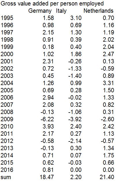Il prodotto per addetto da noi è cresciuto solo del 2% in un ventennio, in Olanda di dieci volte tanto, più che in Germania (circa nove volte tanto). Possiamo fare un rapido confronto degli andamenti di lungo periodo scomponendo la crescita cumulata del CLUP in quella delle sue componenti: