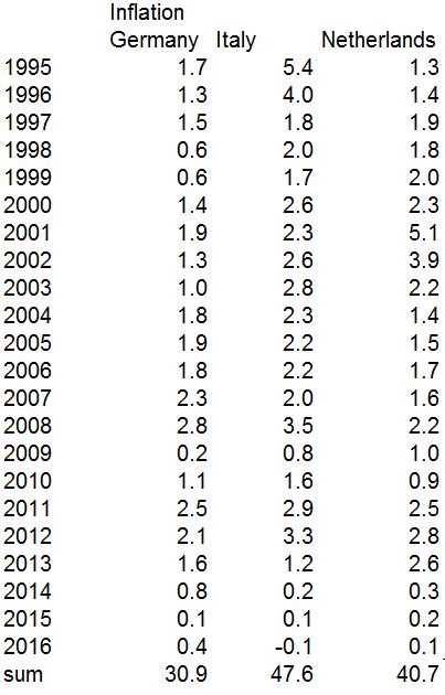 Vorrei farvi notare una cosa: non è che fra Olanda e Italia ci siano state poi enormi differenze in termini di inflazione cumulata. Sette punti in 22 anni sono lo 0.3% di inflazione in più all’anno. Decimali. Vi sembra mai possibile che uno 0.3 di differenza all’anno possa discriminare i virtuosi dai viziosi? Sappiamo già che uno dei motivi per i quali cioè accade è la totale rigidità del sistema (determinata dall’euro), ma non torno su questo qui e ora.