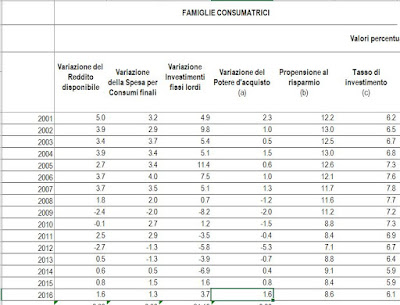 (questa è la Tav. 5 che trovate nel file di serie storiche scaricabile dal comunicato stampa sul sito dell’ISTAT), nel 2016 si è avuto il tasso di crescita più alto del potere d’acquisto (rectius: reddito disponibile in termini reali) delle famiglie dal 2001. Nel 2001 fu 2.3, poi si ebbero solo tassi di crescita inferiori. Solo che il lettore, oltre a non essere necessariamente consapevole della differenza fra dinamica e livello di un fenomeno, istintivamente, per motivi di impaginazione, vede “potere d’acquisto delle famiglie al top dal 2001”, e si rassicura: se non arrivo alla fine del mese, pensa, sarà colpa mia…