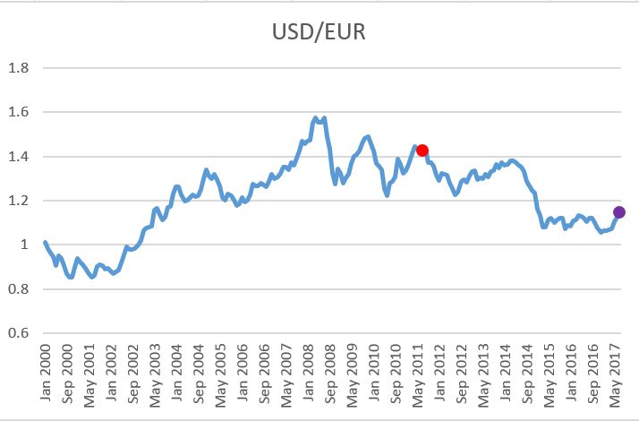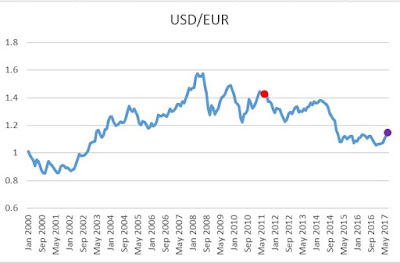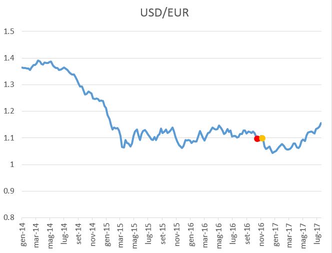 (qui i dati sono settimanali, la variabile è la stessa). Il 26 ottobre 2016, due settimane prima dell’elezione di Trump, formulavo nel mio blog l’ipotesi che l’elezione di un presidente repubblicano potesse aprire la strada a un indebolimento del dollaro (cioè, per chi capisce la goofynomics, a un rafforzamento dell’euro): è il puntino rosso del grafico. E gnente! Il 14 novembre 2016 l’espertone di turno, tal Saravelos, annunciava la parità euro/dollaro per fine anno. Due note di colore: anche Saravelos sembra essere un nome greco, e il nostro Saravelos lavora in Deutsche Bank: un paese e una banca che non sono in ottime acque, e forse capiamo perché…