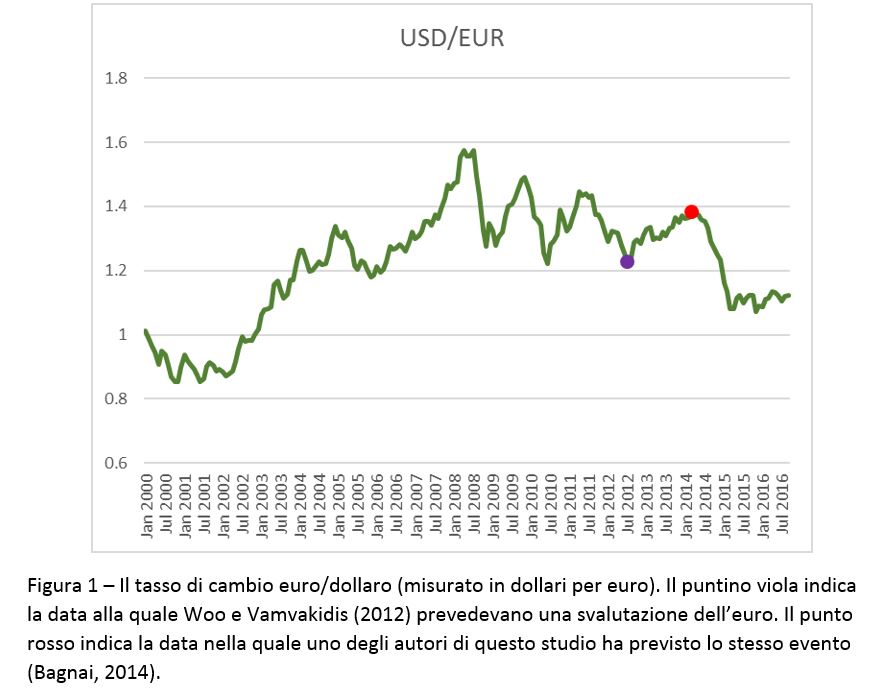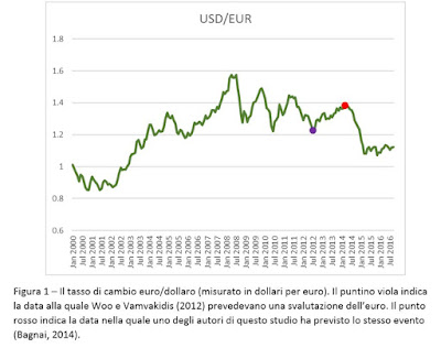 Spiegazione: il 10 luglio 2012 David Woo e Athanasios Vamvakidis pubblicavano uno studio in cui sostenevano che solo un euro più debole avrebbe potuto salvare l’euro, che quindi si sarebbe indebolito nei prossimi sei mesi (da qui una serie di consigli tecnici ai loro investitori). Nel grafico qua sopra la data del loro studio corrisponde al puntino viola, colore della sfiga: in effetti, i nostri espertoni avevano appena emesso questo saggio pronostico, che il cambio euro/dollaro cominciava a salire (invece di scendere). Il “uoteveritteics” di Draghi, che non avevano previsto, aveva improvvisamente reso meno incredibile l’euro agli occhi degli investitori internazionali: invece di una discesa a sei mesi, il cambio sperimentò 24 mesi di ascesa, come da grafico.