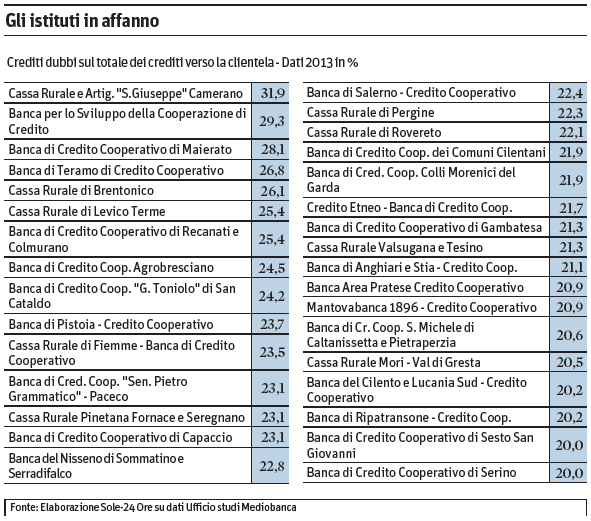 Oltrea Monte dei Paschi di Siena (a seguito delle malversazioni di gestione, connesse con i potentati politici locali) , ai primo posti per peso dei NPL sul totale dei prestiti abbiamo la Popolare dell’Emilia Romagna (BPER), la Popolare di Vicenza (BPV), la Cassa di Risparmio di Genova (CARIGE), il Credito Valtellinese, Veneto Banca e Banco Popolare. Se facciamo un’analisi più approfondita, considerando solo il mondo del credito cooperativo, i dati sono ancora più allarmanti. Ben 33 banche secondo le elaborazioni de Il Sole 24 ore su dati Mediobanca si trovano ad affrontare quote di crediti inesigibili superiore al 20%.Il 41 per cento di queste Bcc si trova al Nord, il 27 per cento al Centro e il 32 per cento al Sud.