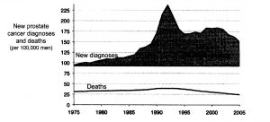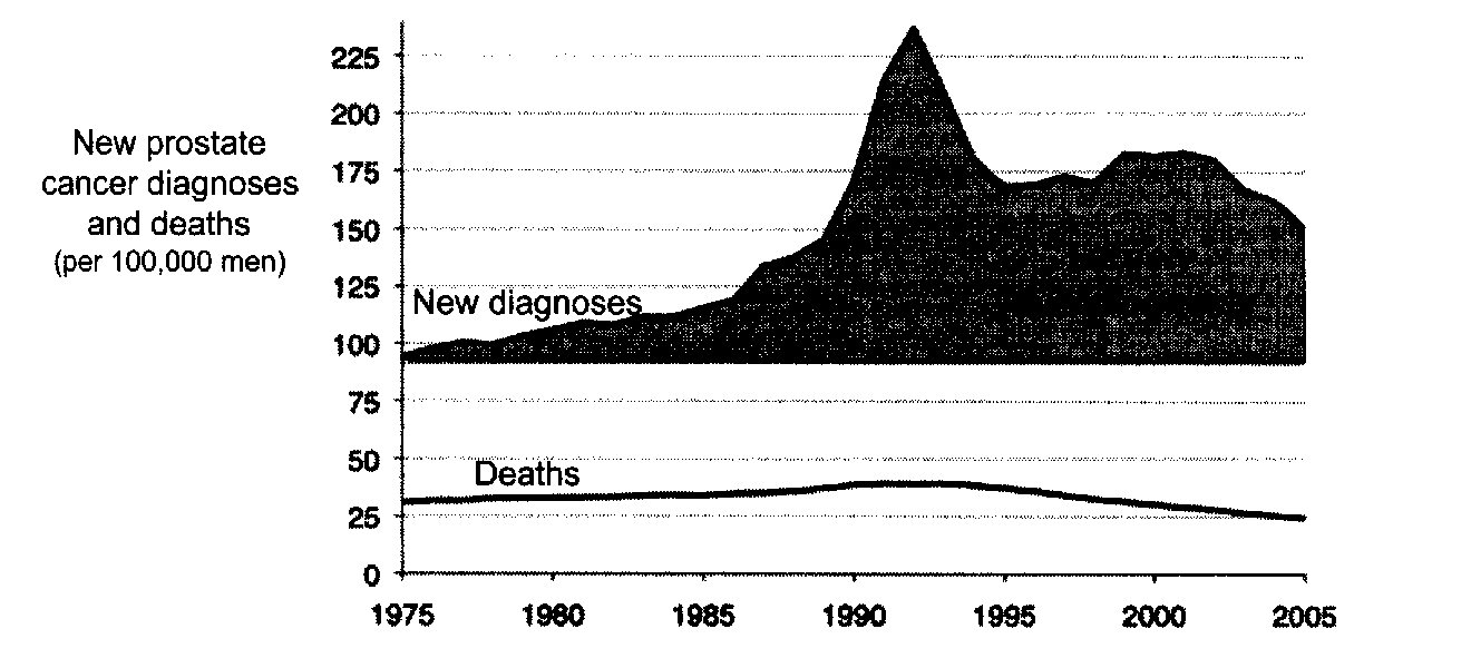 Incredibilmente, in sei anni, dal 1986 al 1992, in concomitanza con l’introduzione dello screening per il cancro della prostata con il PSA, il tasso di diagnosi di cancro della prostata in USA è quasi raddoppiato. Il picco è stato preceduto da un aumento, cominciato nel 1975, legato all’esame istologico dei frammenti di prostata da resezione endouretrale per iperplasia prostatica; ad esso è seguito un certo calo, ma con un tasso sempre superiore del 50% a quello pre-1975.