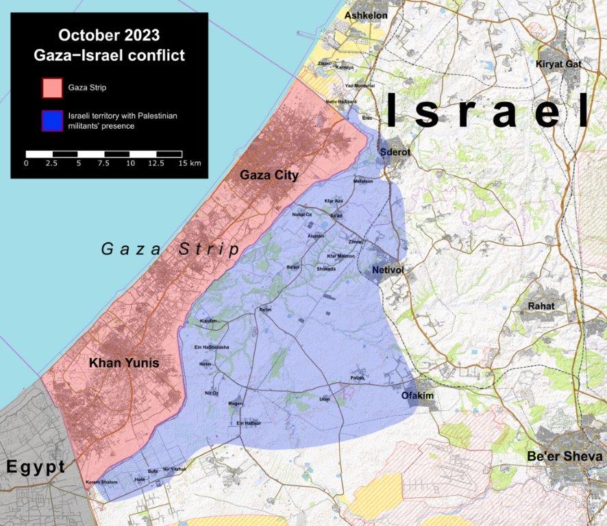 Le forze militari israeliane (IDF) continuano a combattere i miliziani di Hamas infiltratisi in una vasta area del territorio israeliano meridionale occupando villaggi e kibbutz. Secondo fonti israeliane e combatte ti di Hamas nel territorio dello Stato Ebraico sarebbero almeno un migliaio ma l’ampiezza dell’area attaccata (vedi mappa sotto) sembra indicare un numero ben più elevato come confermerebbero anche le difficoltà delle truppe israeliane nel respingere o eliminare le forze nemiche.