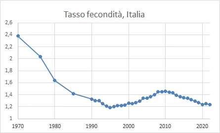 La situazione è stata rappresentata come “inverno demografico”. Purtroppo, è un inverno che dura da decenni ed è destinato a durare vari anni ancora. Vogliamo capire se si tratta di permafrost, di ghiaccio permanente, o se ci sono le condizioni per il ritorno ad una qualche primavera demografica. La base statistica dei nostri ragionamenti è il cosiddetto tasso di fecondità, calcolato come numero di figli per donna feconda, ossia il numero di nati in un dato anno rapportato al numero di donne che, in quell’anno, sono in età riproduttiva. È un numero relativo che, messo in serie storica, aiuta a capire le tendenze della propensione a procreare. In Italia, nel 2022, il valore-indice era 1,24. Il valore di paragone è 2, ossia il livello al quale si realizza l’ideale rimpiazzo di una coppia con un uguale numero di figli.