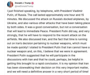 “Ho appena terminato di parlare telefonicamente con il Presidente russo Vladimir Putin. La telefonata è durata circa un’ora e 15 minuti. Abbiamo discusso dell’attacco agli aerei russi parcheggiati, da parte dell’Ucraina, e anche di vari altri attacchi perpetrati da entrambe le parti. È stata una buona conversazione, ma non una conversazione che porterà alla pace immediata. Il Presidente Putin ha affermato, e con molta decisione, che dovrà rispondere al recente attacco ai campi di aviazione. Abbiamo anche discusso dell’Iran e del fatto che il tempo stringe per quanto riguarda la decisione dell’Iran di dotarsi di armi nucleari, che deve essere presa rapidamente! Ho detto al Presidente Putin che l’Iran non può avere un’arma nucleare e, su questo, credo che fossimo d’accordo. Il Presidente Putin ha suggerito che parteciperà alla discussione con l’Iran e che potrebbe, forse, essere utile per giungere a una rapida conclusione della questione. Ritengo che l’Iran abbia tardato a prendere una decisione su questa importantissima questione e avremo bisogno di una risposta definitiva in tempi molto brevi!”