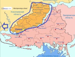Nella cartina che allego (Oblast’ di Kherson) la parte cerchiata di blu e` quella tenuta dagli ucraini (guardando la foce del Dniepr, la riva destra del fiume).