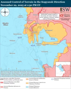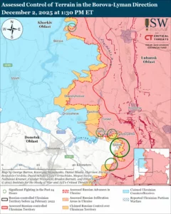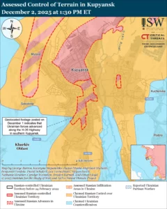 L’insediamento rurale di Kupyansk-Uzlovoi (nella mappa qui sotto), a sud della città sarà occupato completamente dalle forze russe entro pochi giorni, valutava il 3 dicembre il presidente russo Vladimir Putin. “Penso che prenderemo l’insediamento di Kupyansk-Uzlovoi nel giro di qualche giorno”, ha affermato Putin, che ha continuato spiegando che 650 dei circa 2mila edifici presenti nel centro abitato sarebbero già sotto controllo dell’esercito russo.