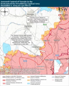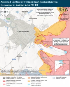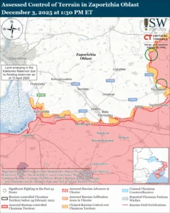 Nei giorni scorsi la situazione si è deteriorata per gli ucraini con la caduta di Zatyshshia, Vysoke e Zelenyi Hai e Vysoke: l’avanzata a sud di Zatyshshia minaccia la periferia nord-orientale di Gulyapole, dove fonti militari ucraine hanno rivelato che le forze d’assalto russe sono penetrate nella notte del 1° dicembre appoggiate da un “fuoco d’artiglieria quasi incessante”.
