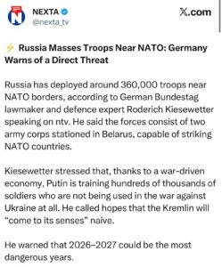Cominciamo con la farsa che dovremmo ingoiare: “360.000 soldati russi vicino ai confini della NATO”. Nessuna immagine satellitare. Nessuna conferma ufficiale. Nessun crollo della struttura delle forze armate. Solo un politico tedesco in televisione che indica un numero come se fosse caduto dal cielo.