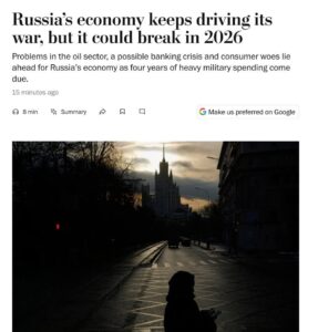 L’ultima versione arriva per gentile concessione del Washington Post, avvertendo che l’economia russa, pur continuando a “guidare la guerra”, potrebbe finalmente crollare nel 2026. Problemi petroliferi. Crisi bancaria. Sofferenza dei consumatori. La solita litania. L’unica cosa che manca è la responsabilità di quante volte questa previsione esatta si sia già rivelata infondata.