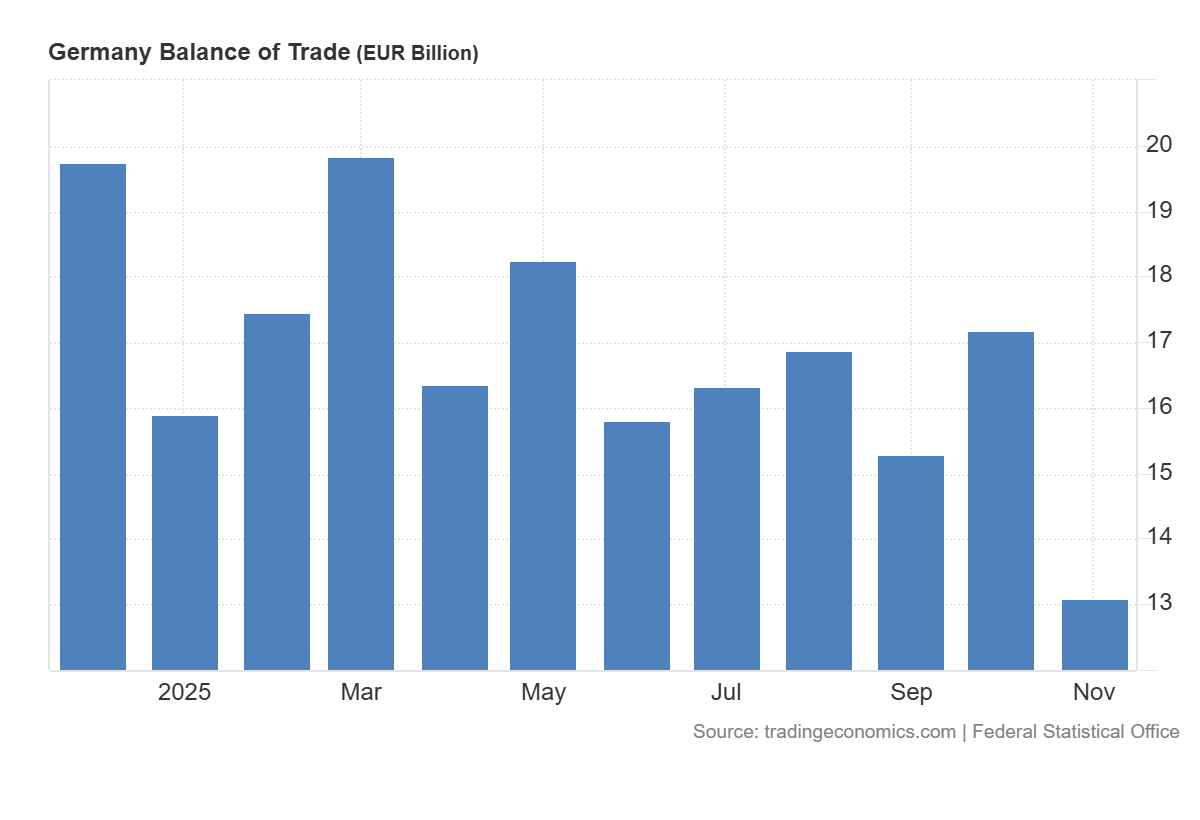 Questa forma grafica di Tradingeconomics permette di afferrare meglio il calo di surplus commerciale tedesco: