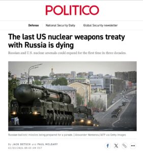 La scadenza del trattato di controllo delle armi nucleari tra Stati Uniti e Russia giovedì potrebbe innescare una corsa globale alle armi nucleari per la prima volta dalla Guerra Fredda, riferisce Politico.