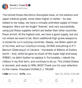 La parte delle menzogne è evidente e salta subito all’occhio: no, le riserve di munizioni “di grado medio e medio-alto” USA non sono affatto “mai state più alte o migliori” e non c’è nessun “rifornimento virtualmente illimitato” di questi armamenti, mentre è vero esattamente il contrario (come ieri si è fatto scappare il povero Rubio, link 1, che ha detto che gli USA ogni mese producono 6-7 intercettori (THAAD), mentre l’Iran nello stesso tempo produce più di cento missili senza contare le migliaia di droni, cosa anche questa passata abbastanza sotto silenzio tanto che devo prendere il filmato da Clash Report e non, che so, dalla Fox), e come stanno scoprendo gli “alleati” del Golfo.