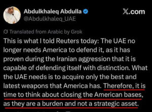 Oggi è circolata la notizia, diffusa da un esperto degli Emirati Arabi Uniti, secondo cui gli Emirati Arabi Uniti non avrebbero più bisogno degli Stati Uniti dopo il fallimento della guerra contro l’Iran e che gli Stati Uniti dovrebbero lasciare il Paese: