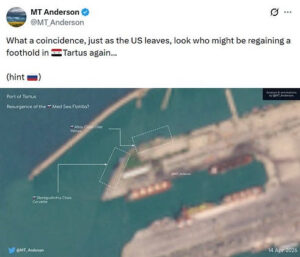Allo stesso tempo, l’account più seguito su X dedicato al monitoraggio navale ha rilevato che questa settimana navi da guerra russe stanno nuovamente «riprendendo piede» a Tartus, in Siria: