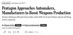 Alti funzionari della difesa hanno tenuto colloqui preliminari con i dirigenti di GM, Ford, GE Aerospace e Oshkosh riguardo all’utilizzo dei loro stabilimenti, delle loro attrezzature e della loro forza lavoro per aumentare la produzione di missili, droni e altri sistemi militari tattici. L’idea è quella di consentire ai produttori commerciali di integrare o supportare gli appaltatori della difesa tradizionali, soprattutto alla luce del fatto che i conflitti in corso in Ucraina e in Iran hanno ridotto le scorte statunitensi.
