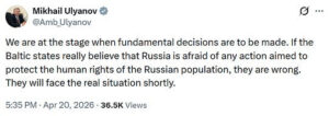Tornando alla vicenda dei Paesi baltici, oggi la situazione è giunta al culmine quando Mikhail Ulyanov, rappresentante permanente ufficiale della Russia presso le organizzazioni internazionali a Vienna, ha lanciato la seguente minaccia su X: